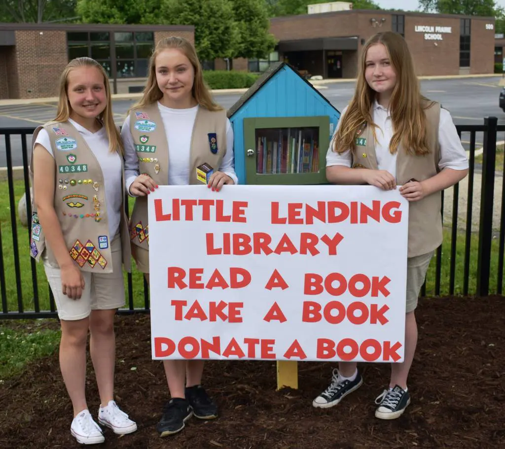 They found the idea on Pinterest, researched potential locations, then reached out to Schaumburg and Hoffman Estates Park Districts to see if their idea was feasible. They approximated the cost of materials, purchased materials, built and painted the libraries. To fill the libraries with books they hosted a book drive at school, purchased books from the Schaumburg Library used book sale and received some donated books.